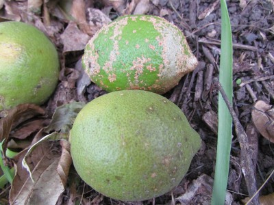 This really doesn't appear to be a problem that affects the inside of the fruit.. They have been collected & will be squeezed & the juice frozen for later use..